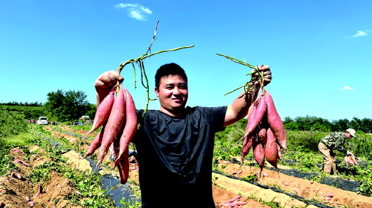 9月22日,烟台钢盛农业专业合作社张新展示刚收获的“烟薯25”。杜晓丹 摄