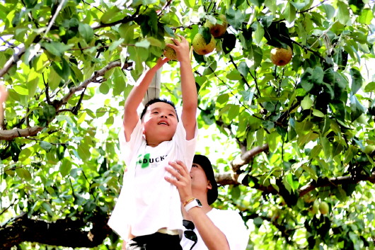 10月5日,游客在果园里采摘莱阳慈梨。吕奇 摄