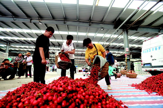 5月22日,烟台大樱桃上市,果农将成交樱桃倒在指定位置。吕奇 摄