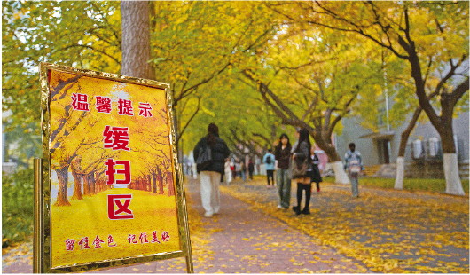 “一年好景君须记,最是橙黄橘绿时。”秋末冬初,多地进入“赏叶模式”。在山东一些高校,有一种限定浪漫叫“落叶缓扫”,最大程度保留落叶景观,渲染营造了一个个充满诗情画意的秋日童话。图为11月12日,山东师范大学(千佛山校区)校园里,在学生往返教室和宿舍的必经之路上,设置了“落叶缓扫区”。同学们纷纷驻足观赏秋叶、打卡拍照,留住一抹金色,记住美好校园生活。 王帮栋 摄影报道