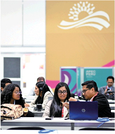 11月12日,在秘鲁首都利马,记者在APEC国际媒体中心内工作。 新华社发