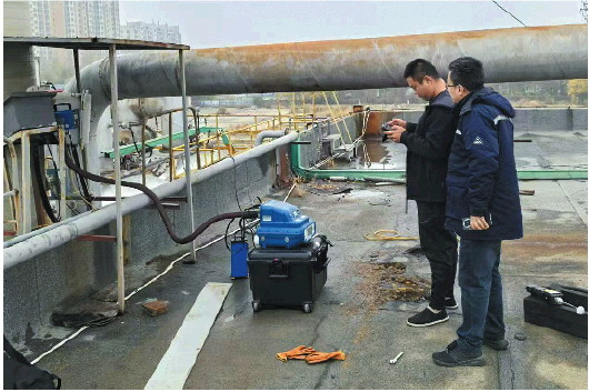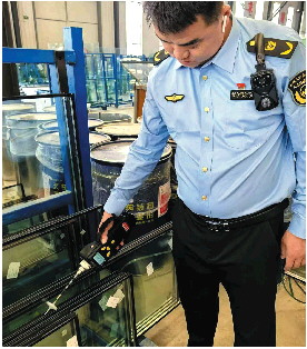 ◤执法人员使用PID检测企业挥发性有机物物料产品情况。