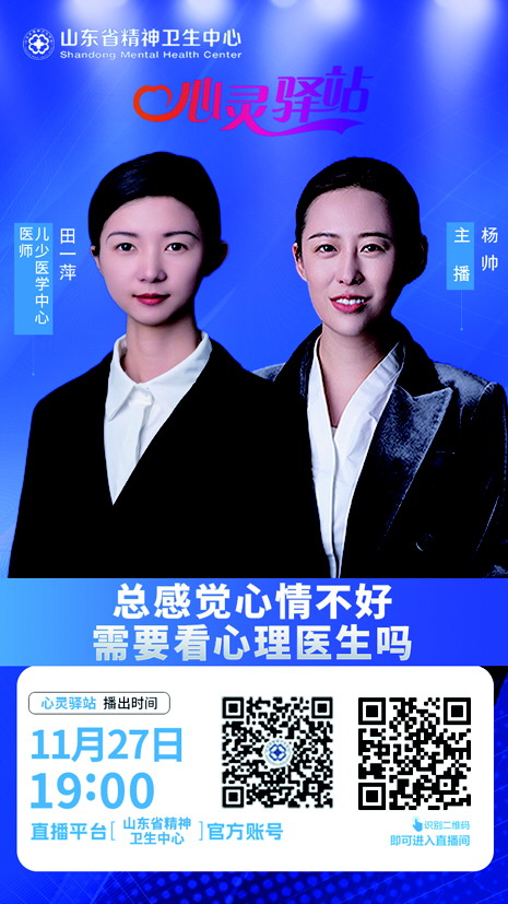 那么,负面情绪持续多久便要关注?哪些情况又需要心理医生帮忙?11月27日19点,山东省精神卫生中心儿少医学中心医师田一萍将做客“心灵驿站”直播间,就负面情绪的缓解与应对方法进行科普讲座,敬请关注。