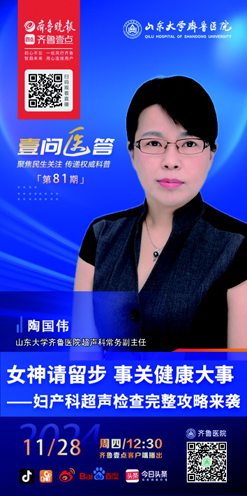 《健康中国行动(2019—2030年)》指出,妇幼健康是全民健康的基础。超声诊断作为现代医疗重要的诊断工具,在护航女性健康,预警相关信息等方面,发挥着重要作用。那么,妇科超声检查与产科超声检查分别诊断女性朋友的哪些生理指标?关于超声诊断人们又有哪些常见的认识误区需要辨别?11月28日12时30分,山东大学齐鲁医院超声科常务副主任陶国伟将做客“壹问医答”直播间,围绕妇产科超声检查方面的知识进行科普讲座,敬请关注。