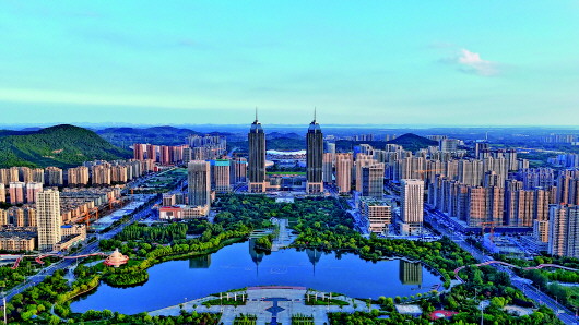 航拍枣庄双子星、凤鸣湖一带美景。