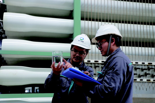 两名环保技术人员在中水回用设备前观察处理后的水样。