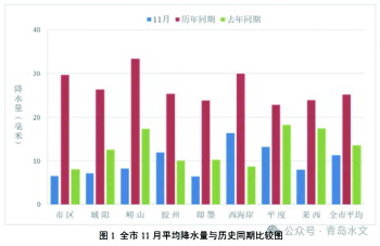 11月,青岛市全市平均降水量11.3毫米,比历年同期偏少55.2%。11月末全市23座大中型水库(不含棘洪滩)蓄水56353万立方米,列1960年有水文统计资料以来历史同期第2位,各区市大中型水库蓄水量较历年同期均偏多。