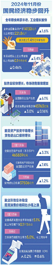 国家统计局12月16日发布11月份国民经济运行情况相关数据。生产较快增长,需求继续扩大,就业物价总体稳定,楼市和股市趋于活跃……从一系列指标中可以看出,在宏观政策发力显效作用下,国民经济稳步回升,全年经济社会发展主要目标有望顺利实现。