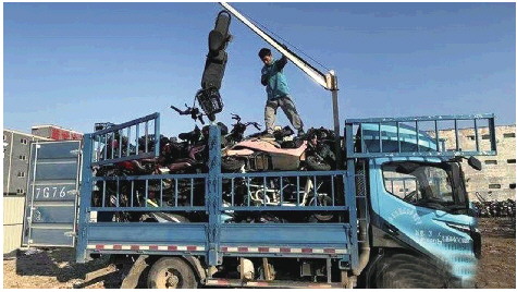 现场,一辆大型吊车正在把堆放在一起的车架装上车。郭女士告诉记者,它们将被送往济阳的一家塑料厂。“车架子上还有很多零部件,但是比较复杂,我们这一环节就不再进行细分拆解。”郭女士说,每辆电动自行车能拆解出23-28公斤的废铁,约占整车重量的50%。
