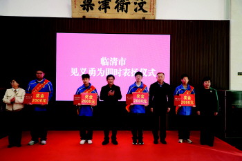 仪式上,临清市委政法委分管日常工作的副书记张继香宣读了中共临清市委政法委、市见义勇为协会《关于授予曹东硕等同学临清市见义勇为模范的决定》。李明艳、王兴刚、王钰、姚晨并向曹东硕、王泰哲、景金浩、张德奇四名同学颁发见义勇为证书和2000元奖励以及向学生家长颁发“见义勇为光荣之家”门牌。