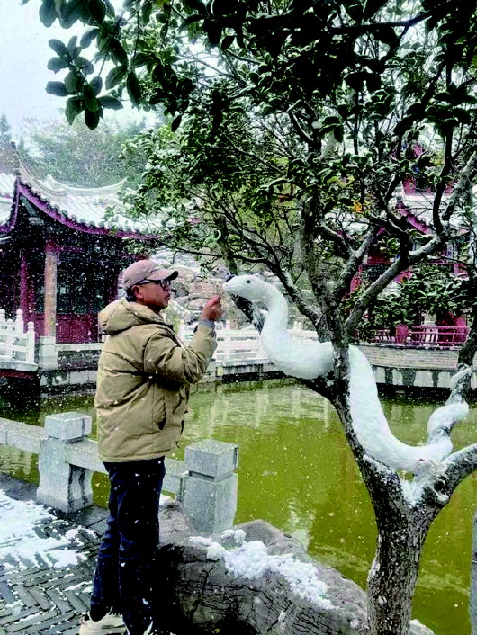 今冬初雪,玩雪达人李仁敬在毓璜顶公园堆出“白素贞”。