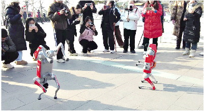 与传统宣传方式不同,Go2不仅能通过语音传达信息,还能进行多种趣味交互,“Go2”的“饲养员”现场为游客展示了一段“绝活”——随着“饲养员”指令的下达,两只机器狗分别展示了“拜年”“翻跟头”“握手”“跳舞”等动作,极大地吸引了游客的目光,引得游客直呼有趣。