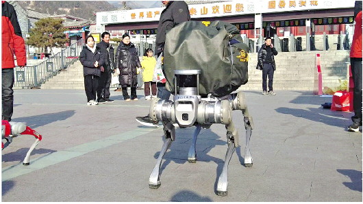 2024年12月30日,一大、两小,三只机器狗在泰山红门风景区爬上爬下,迅捷灵动,吸引了不少游客驻足观看,有游客笑称:“这机器狗跑得好快啊,我们都有点追不上”。