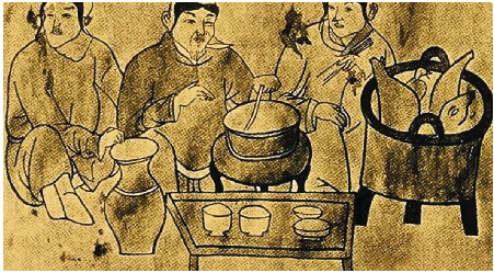 《东京梦华录》卷九云:“十月一日,宰臣已下受衣着锦袄……有司进暖炉炭。民间皆置酒作暖炉会也。”《梦梁录》卷六曰:“十月孟冬……有司进炉炭。太庙享新,以告冬朔。诸大刹寺院,设开炉斋供贵家。新装阁,低垂绣幕。老稚团,浅斟低唱,以应开炉之序。”由此可见,宋代的火锅已平民化。南宋林洪《山家清供》上卷“拔霞供”说得更具体:“向游武夷六曲,访止止师,遇雪天,得一兔,无庖人可制。师云:‘山间只有薄枇,酒、酱、椒料沃之,以风炉安座上,用水少半铫,候汤响,一杯后各分以筋,令自夹入汤,摆熟啖之,乃随意,各以汁供。’因用其法,不独易行,且有团栾热暖之乐。”