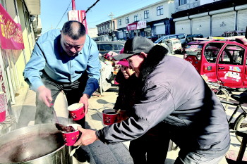 先赶集,再喝粥。正午的阳光越来越盛,腊八粥的香味儿也越来越浓。一桶百余斤的腊八粥被抬到门口,盖子一掀,惹得人食指大动。贾寨新村党委书记贾立峰拿着舀勺,给排好队的村民们开始打粥,过程中还不忘打趣“腊八粥甜,注意假牙”,引来笑声一片。浓稠的腊八粥分到每个人手里,喝起来甜甜的,心里面暖暖的。