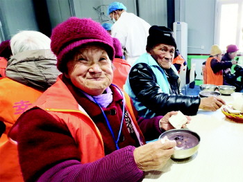 幸福食堂的老人在喝腊八粥。
