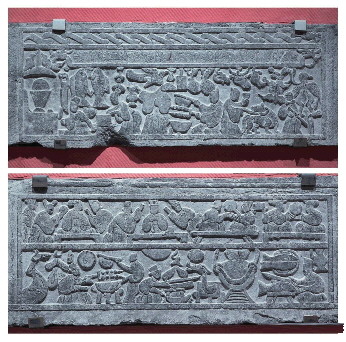 第一块画像石就像一副“庖厨图”,左边吊挂着一条蹄足可见的牛腿,有一人高,右边紧挨着挂着一块肉,再往右是一个戴高冠、长胡子、着花边衣领长袍的男子呈蹲坐状,左手持一把叉状物,上有两串肉串,正放在三足铁鼎上烤。他的后面有一个圆形案板,放着刚切好的肉块。还站着一个戴小帽、着长袍的人,手持扇子煽火。