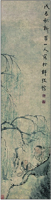 《戏蛇图》(纵89厘米、横23厘米,清华大学艺术博物馆藏)采用写实手法,通过描绘民间弄蛇艺人浪迹江湖的漂泊生涯,展示社会底层人民的生计状况及其生活场景。画面上正值初春时节,杨柳依依,两位江湖艺人穿着朴素,面容清瘦,行色匆匆地奔波于绿柳坡道之间,后者背负蟾蜍,迎头赶路,前者肩负一蛇,回首张望,他们走村串巷,卖艺谋生。右上方款识“戊辰秋,新罗山人写于解弢馆”,钤“华喦”“布衣生”两白文印。画家华嵒这种客观反映社会现实生活的写实题材,在当时崇尚山水、花鸟、仕女的文人画中颇为鲜见而独具特色。