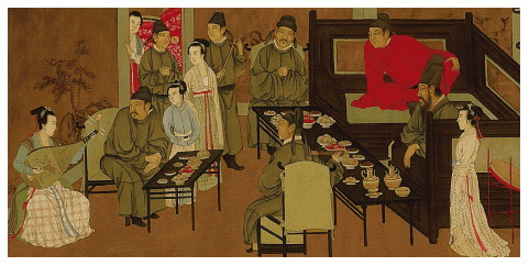 唐代此风不减,不管宫里还是民间,都在除夕守岁时喝柏叶酒。杜审言在参加宫廷御宴后写下《守岁侍宴应制》:“季冬除夜接新年,帝子王孙捧御筵。弹弦奏节梅风入,对局探钩柏酒传。”人们一边行探钩的酒令,一边大喝柏叶酒。探钩又名藏钩,是一种猜拳游戏,将玉钩、银钩等小物件藏在手中,让其他人猜在哪只手里,在南北朝时已是春节的保留节目。孟浩然在除夕夜参加朋友张子容的家宴:“续明催画烛,守岁接长筵。旧曲梅花唱,新正柏酒传。”这场宴会的主人张子容也在《除夜乐城逢孟浩然》中唱和:“樽开柏叶酒,灯发九枝花。”孟、张两位好友,在摇曳的烛光下、在梅花曲的伴奏中,共饮柏叶酒,喝着喝着,就从旧岁进入了新年。