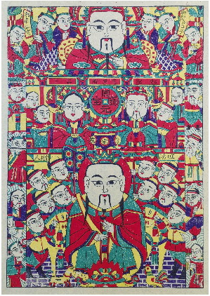 灶神年画有很多版本,本文以杨家埠年画中的“大灶王”为例进行说明。这个版式分为三层,共有三十二个人物,是灶神年画中最为复杂的一种。