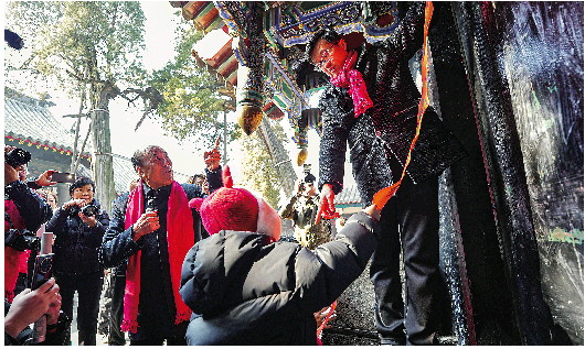 重光门前,只见孔令绍郑重地接过刚刚书写好的孔府春联和新拓制的孔府门神,用毛刷蘸糨糊斜斜地一刷,再将对联及门神一一递给孔颖,孔颖站在木凳上,小心翼翼地将其贴至重光门上,接着抱起儿子孔齐维翰,一起手拿黍子笤帚在对联及门神上轻轻扫抹拍打……祖孙三代在现场演绎的孔府春联和门神的张贴程序,也瞬间吸引了众多现场游客的眼球。