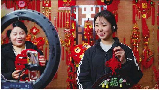 加工生产厂区热火朝天,线上的网店直播间,订单亦是蜂拥而至。“这是新出的桃木仿玉款式,小尺寸挂在床头温馨,大尺寸放在客厅喜庆。”红花镇巧艺电子商贸有限公司的直播间内,村民李娜正在直播带货,她用一口乡音把自家制作的中国结介绍给天南海北的网友。后台的助理快速整理订单信息,分包给工厂工人,开播2个小时,已经卖出400多个订单。