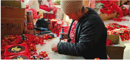 在红花镇轩然工艺品厂里,村民正在赶制一批中国结订单。