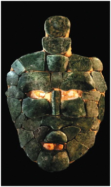 在危地马拉乔奇塔姆的玛雅国王墓中发现了一个华丽的玉面具,它由互锁的玉片制成,并用贝壳做眼睛和牙齿。