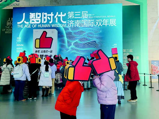 “点赞!”“棒棒的!”2月22日周六,山东美术馆大厅,一位父亲和孩子戴着“点赞”头套开心地互动着,旁边的妈妈用手机拍下了这一幕。这是“济南国际双年展”表演艺术作品——《来吧,让我们一起点赞艺术》的温馨一角。