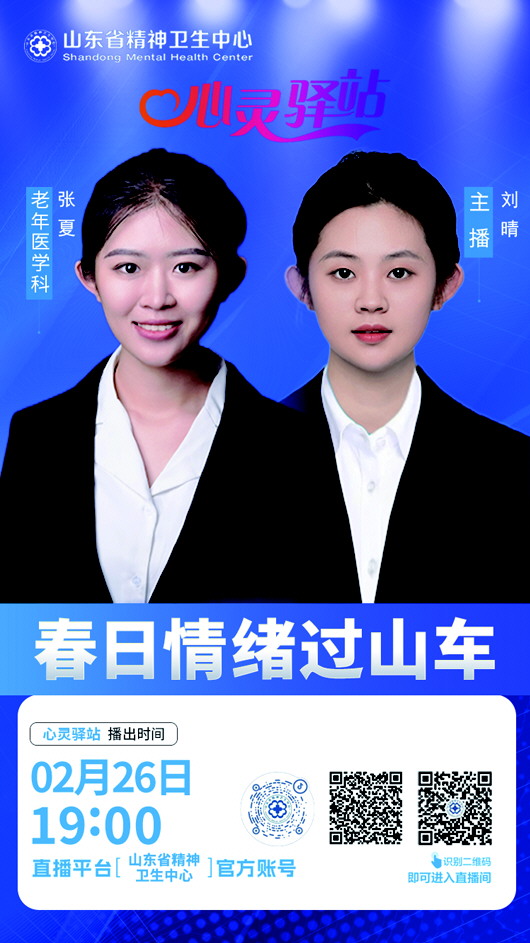 东风拂面,万物复苏,人们的心情也随之舒缓。但时不时的倒春寒与雨雪天气,也常常使人心情沮丧。有研究发现,每年春季,抑郁症、焦虑症、双相情感障碍等精神与心理疾病的发病率会明显上升。2月26日19点,山东省精神卫生中心老年医学科张夏做客“心灵驿站”直播间,围绕“春日情绪过山车”进行科普讲座,帮助大家更好地理解春季情绪波动的科学原理,以及如何有效管理自己的情绪,确保身心健康。