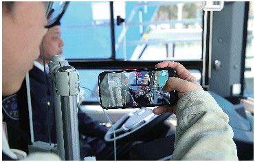 记者体验无人驾驶公交车。