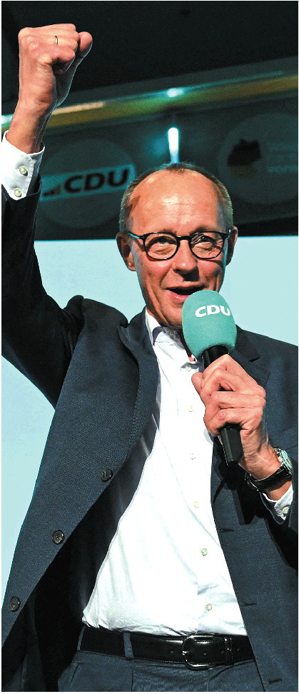 2月23日,在德国首都柏林的基民盟总部,联盟党总理候选人默茨在出口民调结果公布后发表讲话。 新华/路透