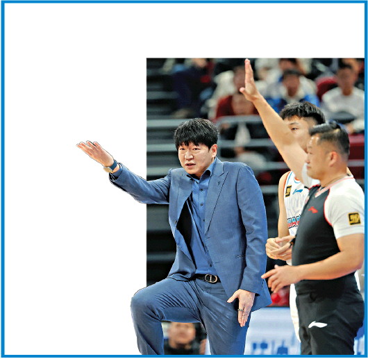 ◥3月5日,山东高速队主教练邱彪(左)在比赛中与裁判交流。 新华社发