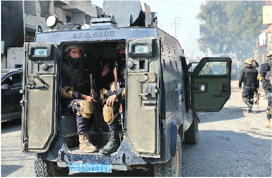 3月9日,叙利亚安全部队人员在拉塔基亚省杰卜莱的街道上巡逻。 新华社发
