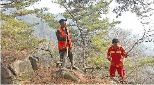 3月10日,在淄博市沂源县南鲁山镇茨峪村,王子忠(左)和儿子王涛在山林间巡护。今年78岁的王子忠是淄博市沂源县南鲁山镇茨峪村村民,他和55岁的儿子王涛接力造林护绿42年,用两代人的痴心与坚守,谱写着一段爱绿护绿的绿色佳话。42年来,王子忠一家累计栽植侧柏、刺槐、杨树等树木20余万株,义务造林面积达2000余亩。 新华社发