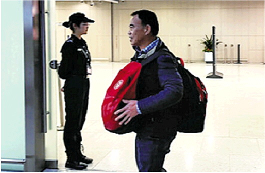 11日晚7点20分,在青岛胶东国际机场港澳台到达大厅,刘德文缓缓走入众人的视野,与往常不同的是,这一次他的胸前和背后各有一份骨灰放在熟悉的红色背包中。此时,亡故老兵的亲属连忙快步上前,搀扶着刘德文走向大厅的一角。