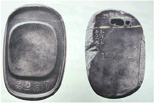 这块近似椭圆形端石为七砚之首,是告别右手的首次试刀石。他根据正面砚首处有两条玉带、中间夹杂侵蚀而形成的大小三个孔洞,即所谓“虫蛀”,就巧妙地把虫蛀化为墨池,让它与玉带组成砚名“玉带池”。左边上部落有行书款“乾隆丁巳石道人成”。此砚双面可用,凹槽的背面一端刻有篆书:“下岩上品”。名辞与落款俱填金。