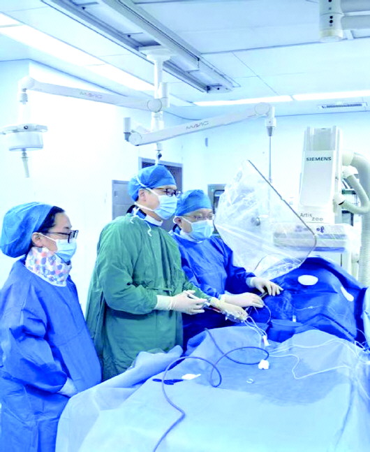 2月23日,在麻醉科、介入导管室通力协作下,崔爱东团队运用标测系统,经股动脉建立微创通道,对双侧肾动脉实施4象限、多位点射频消融。术中经过标测系统成功找到多处交感神经热点,并逐一对其实施消融。消融后,重复电刺激验证证实消融有效。都先生的血压得到有效控制,身体恢复良好,术后两天顺利出院。