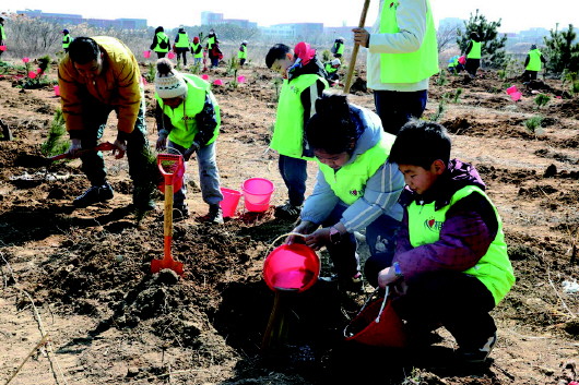 上午8点半,威海九龙城购物广场集结起蜿蜒长队,参与植树的市民陆续登上大巴。车头飘扬的丝带与孩童手中的小铁锹相映成趣,延续十年的植树大军再度开向植树场地。到达后在工作人员示范下,家长带着孩子挥锹培土、扶苗浇水,将800多株黑松稳稳植入春泥。许多家庭带着孩子们亲手绘制的木制心愿牌,挂在小树上,让心愿和小树共同发芽成长,田间此起彼伏的"再踩实些""水要浇透"的叮嘱声,织就最动人的春日图景。