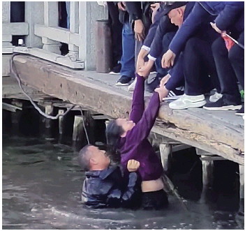 3月18日下午,在济南大明湖景区历下亭附近,一位老人不慎掉入湖中,四川游客赵佳见状纵身跃入湖中施救,在岸上人员的帮助下,合力将老人救起。