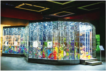 对于新生事物,艺术家总是先行一步去想象去感知去表达,且是形象表达。一楼展厅最引人注目的当数邓国源题为《诺亚花园Ⅱ》的作品,晶莹剔透的玻璃房内是五彩缤纷的装置,有梅兰有竹菊有假山有草木,色彩斑斓造型奇特,观者小心地行走于玻璃镜面上,既可以用心地揣度艺术家的创作意旨,也可以脑洞大开自由想象和解读。漫步在三楼四楼的展厅,尽管一般观众对大多数作品“不解其中意”,但并不影响被一件件画面独特、装置奇异的作品震撼并受到启迪。韩国艺术家李承熙的《红竹记忆》,数十根竹竿矗立一隅,高高的,直直的,红中带白,远远地就把你的眼球吸引过去。凝视着,思考着,依然很难看出创作者要表达的主题。用手机扫一下旁边的二维码,其中有这样的表述:希望观者在看到其竹子作品时,能产生一种熟悉却又陌生的感觉,寻求时空与认知思维的融会贯通……一个题为《边界》的装置作品,作者用铁条缠绕起一个矩形笼子,笼内悬挂着一个倒置的三角形铁丝网兜,网兜里放置着很多鹅卵石。构思简单,寓意却深刻。