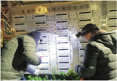 大帅(左)借助手电筒的光亮把牛奶放进订户的奶箱。