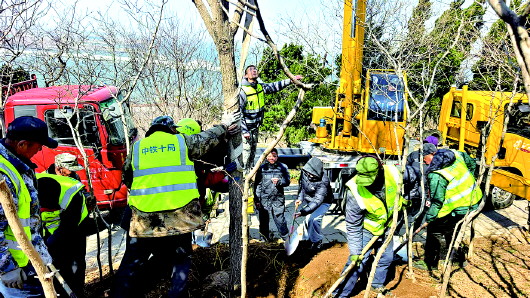 阳春三月,正是植绿好季节。在蓬莱阁古建筑区、老北山的花卉苗木栽植现场,园林工人们配合默契,扶正树体、挥锹填土、压实加固,整个过程高效有序。