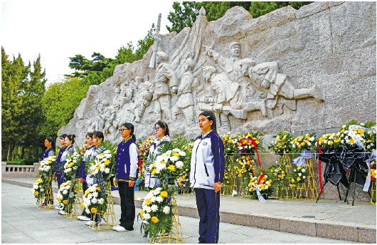 4月4日,在山东省济南市,学生代表在济南革命烈士陵园向先烈敬献花篮。