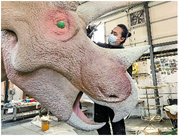 山东(无棣)海百合环境艺术公司的工人正在进行三角恐龙的制作。 东营日报 延智 摄