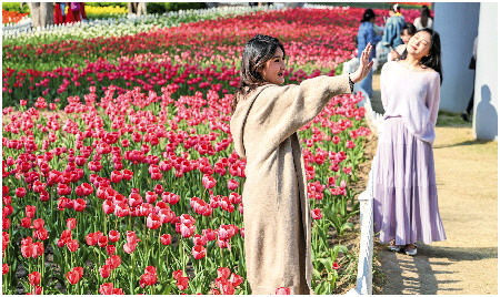 滨州市经济技术开发区秦皇河百万株郁金香陆续绽放,吸引了各地游客观赏游玩。 山东商报 王晓峰 摄