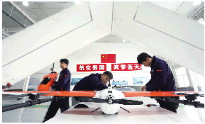在滨州市低空飞行服务中心,工人们在智能共享加工中心进行无人机的安装。  滨州市新闻传媒中心 李默 摄