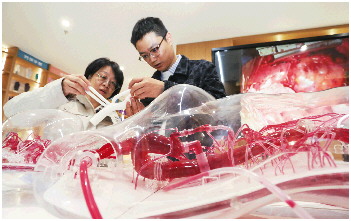 滨州愉悦家纺研发用微米级纱线织造人造血管,突破精密织造、赋弹紧密定型和生物涂层等关键技术,解决了人造血管柔顺性、抗渗透性、生物相容性等难题,可用于置换人体主动脉,目前已进入人体临床试验阶段。  滨州市新闻传媒中心 李默 摄