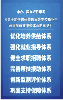 意见明确,强化就业指导体系、健全求职招聘体系、完善帮扶援助体系、创新监测评价体系。求职招聘是高校毕业生就业的关键环节,意见在健全求职招聘体系方面提出一系列举措,更好满足高校毕业生对高品质服务的需要。