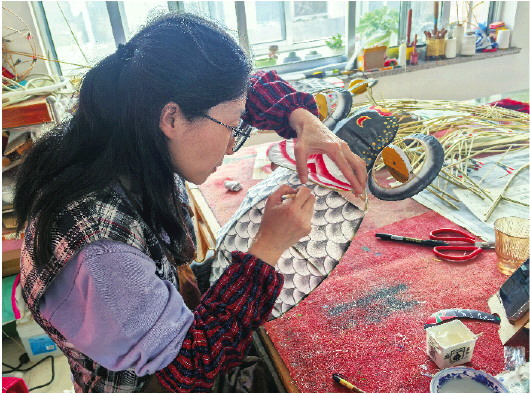 杨红卫工作室里,大家正忙着制作风筝。 吴昊 摄